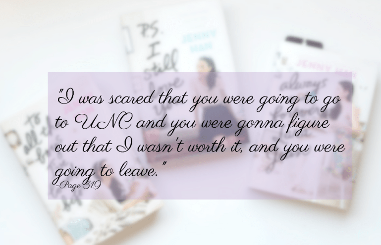 After a wise word from Trina, an epiphany hits Lara Jean that maybe her mother’s opinion on college and boyfriends would be different had she been alive to meet Peter. It really struck me because I am one to take other’s opinions to heart as well. In combination of keeping her dead mother’s values, and living up to her role model sister’s standards, no wonder Lara Jean was trying to make a “perfect last chapter” for her relationship! She felt obligated to because the figures in her life did so! It’s so important to be your own person and have your own opinions and values. However, that doesn’t mean completely disregard others. (Hence why I put “…too much” for this point.) Having other’s perspective on something can totally give you a deeper understanding of the topic at hand, and overall help you make your decision about how you feel regarding the matter.